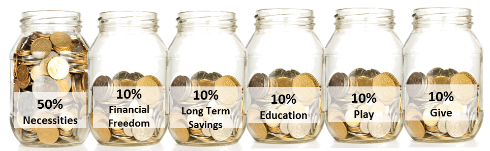 Nosso sistema foi inspirado nesse método: 50% para necessidades básicas, 10% para liberdade financeira, 10% para poupança de longo prazo, 10% para instrução, 10% para diversão e 10% para doações. Você pode usar os mesmos potes ou personalizar os seus.